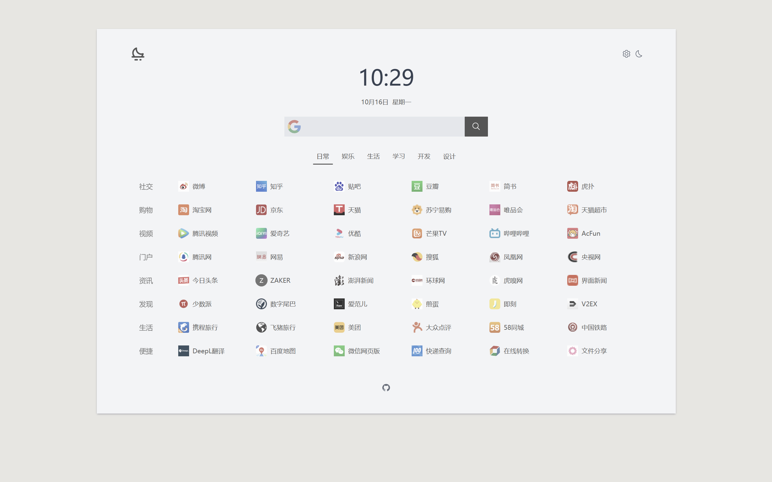 ## 介绍 一个简约风格的网址导航页,基于 [MIT](./LICENSE) 协议开源。你可以直接使用它,也可以在此基础上客制化自己的网址导航😊。  ## 特性 - ⚡ 高效导航 - 极简样式,快速访问 - 🍎 从心所欲 - 完全自由地增删改网站,支持自定义网站图标 - 🛫 拖拽排序 - 快速调整网站顺序 - 🔍 搜索词联想 - 支持必应、谷歌、百度等多个搜索引擎 - 📱 响应式布局 - 可在任意尺寸的设备上正常显示 - 🎨 主题切换 - 内置多种主题样式,可自由切换 - 🌙 夜间模式 - 爱护你的双眼 - 🌍 I18n - 支持简体中文、英文和日文 - 📤 导入/导出数据 - 在不同设备间同步数据 - 📦 浏览器插件 - 新建标签页时打开 [Moon](https://moon-start.netlify.app/) ## TODO - 后端服务 - 获取 favicon - 同步数据 - 更多... ## 快速开始 克隆仓库 ```bash git clone https://github.com/jic999/moon-web-start.git ``` 进入目录 ```bash cd moon-web-start ``` 安装依赖 ```bash pnpm install ``` 启动项目 ```bash pnpm dev ``` ## 浏览器插件 插件适用于谷歌浏览器,可以在新建标签页时自动进入[Moon](https://moon-start.netlify.app/)。 该插件暂未在Chrome应用商店发布,若要使用,请按照以下步骤: 1. 解压本项目下`extension/moon-chrome-extension.zip'`。 2. 在谷歌浏览器的扩展程序界面,打开右上角的`开发者模式`。 3. 点击左上角`加载已解压的扩展程序`。 4. 选择刚刚解压的`moon-chrome-extension`目录。 ## 感谢 - [一为API](https://api.iowen.cn/),提供了免费获取网站favicon的开放接口。 - [0x3](https://0x3.com/),带给我灵感。
