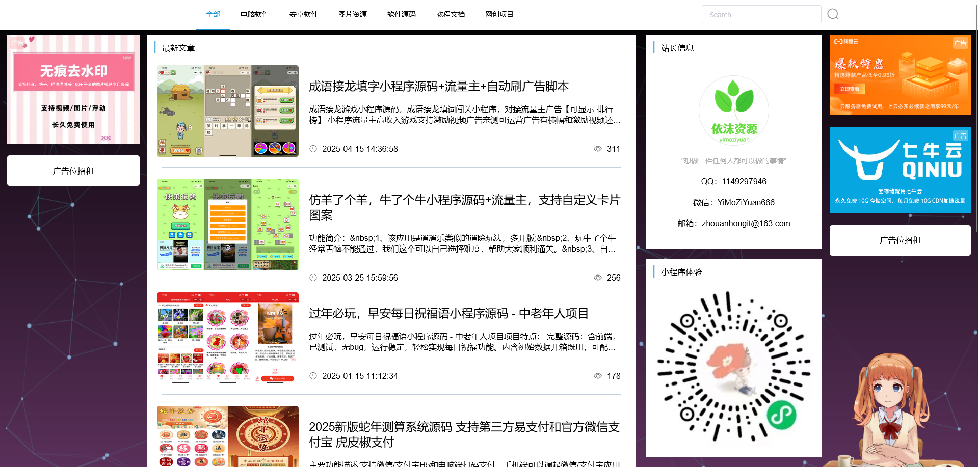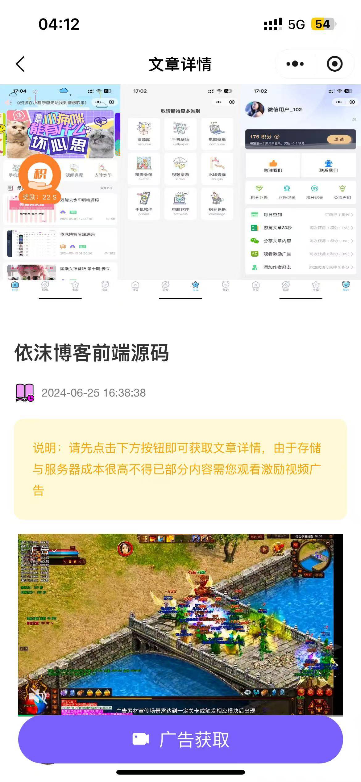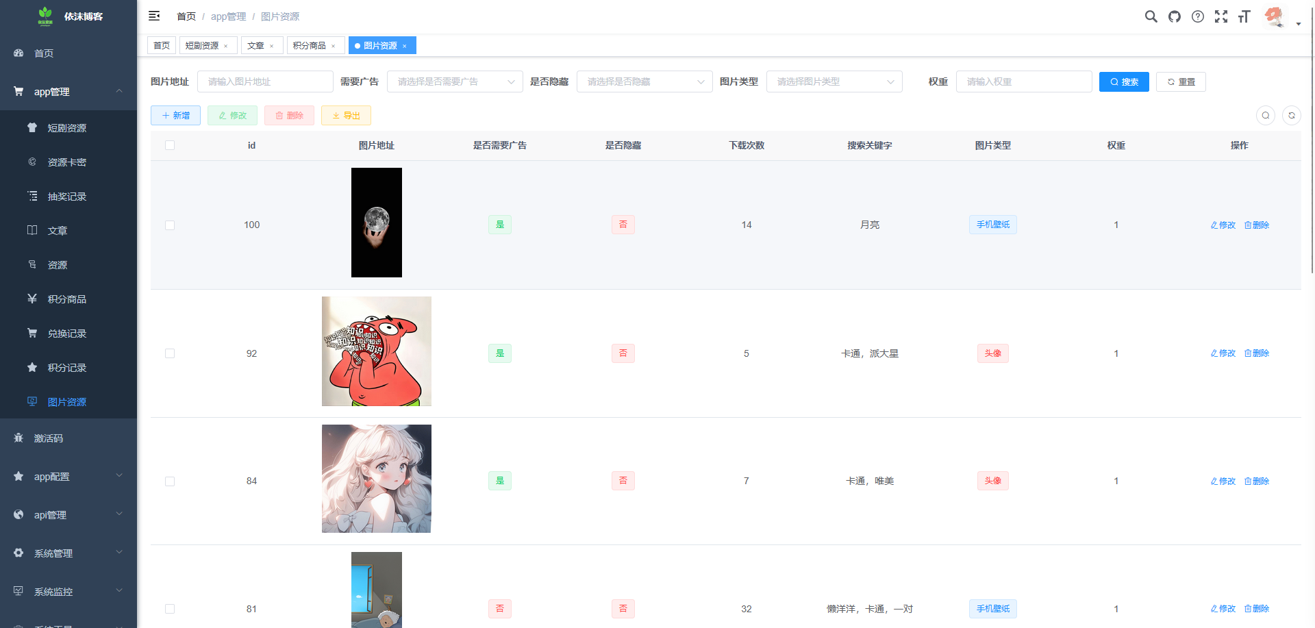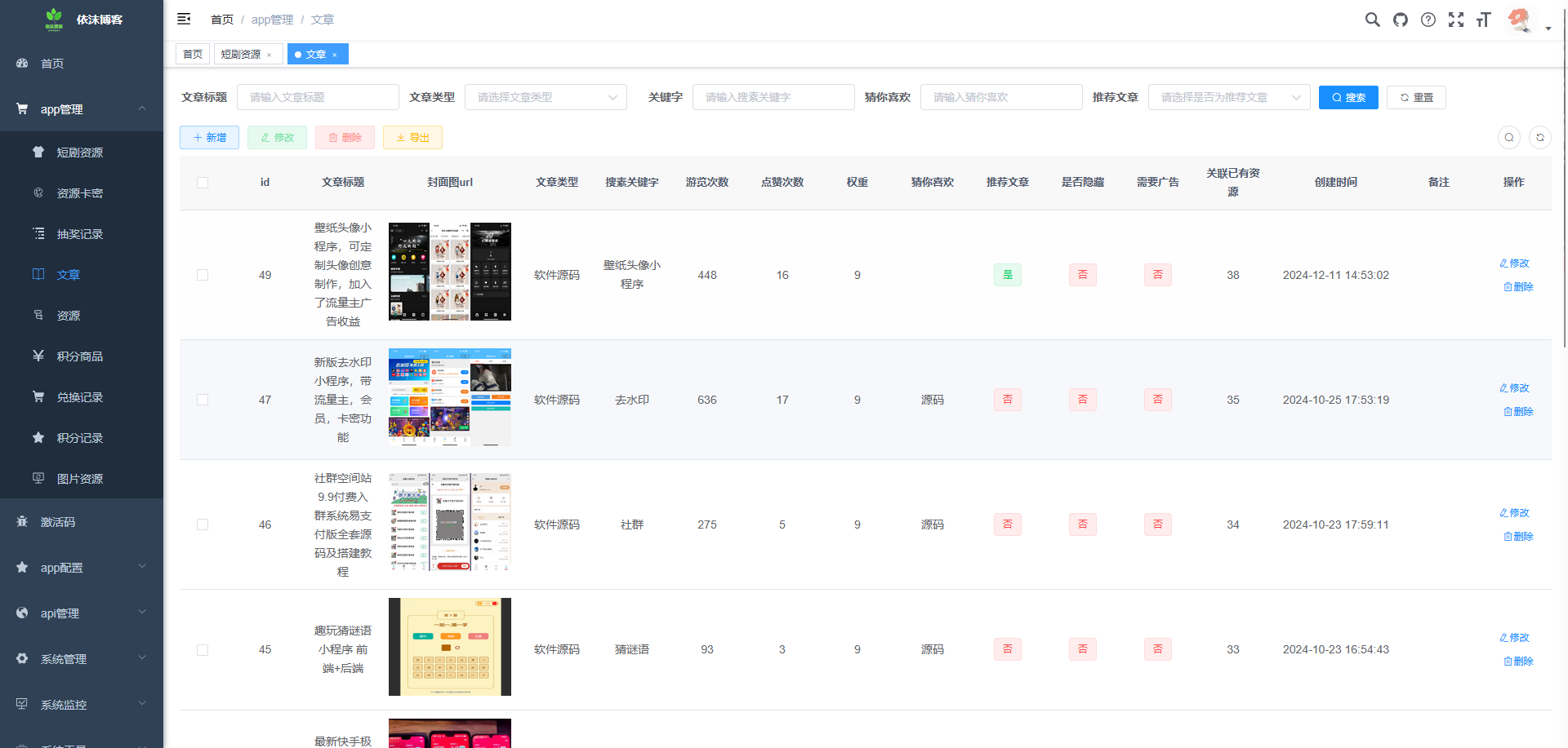 # 依沫资源博客 **Repository Path**: ananyouu/yimo-resource-blog ## Basic Information - **Project Name**: 依沫资源博客 - **Description**: 依沫资源博客专为内容/资源下载场景设计,一站式解决内容带货、流量、资源变现,资源博客文章分享,目前以实现个人博客,文章发表,资源收集下载,手机壁纸下载,电脑壁纸下载,头像下载,支持抖音,快手,小红书等 100+ 平台的图片视频水印去除去水印,内容展示均已实现微信流量主广告变现功能,可根据自己需要进行配置, 还加入了积分系统和积分商店,可让用户完成相应的任务获得积分换取奖励。 - **Primary Language**: Unknown - **License**: MIT - **Default Branch**: master - **Homepage**: None - **GVP Project**: No ## Statistics - **Stars**: 110 - **Forks**: 50 - **Created**: 2024-05-14 - **Last Updated**: 2025-11-01 ## Categories & Tags **Categories**: blog **Tags**: uni-app, 去水印, 广告变现, 博客, 壁纸 ## README
