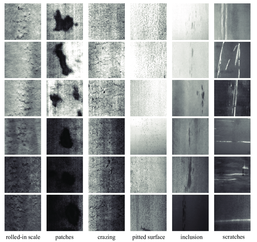## 2. Common Datasets for Industrial Surface Defect Detection ### 1)Steel Surface: NEU-CLS NEU-CLS can be used for classification and positioning tasks. - Official Link:http://faculty.neu.edu.cn/yunhyan/NEU_surface_defect_database.htmlThe surface defect dataset released by Northeastern University (NEU) collects six typical surface defects of hot-rolled steel strips, namely rolling scale (RS), plaque (Pa), cracking (Cr), pitting surface (PS), inclusions (In) and scratches (Sc). The dataset includes 1,800 grayscale images, six different types of typical surface defects each of which contains 300 samples. For defect detection tasks, the dataset provides annotations that indicate the category and location of the defect in each image. For each defect, the yellow box is the border indicating its location, and the green label is the category score.