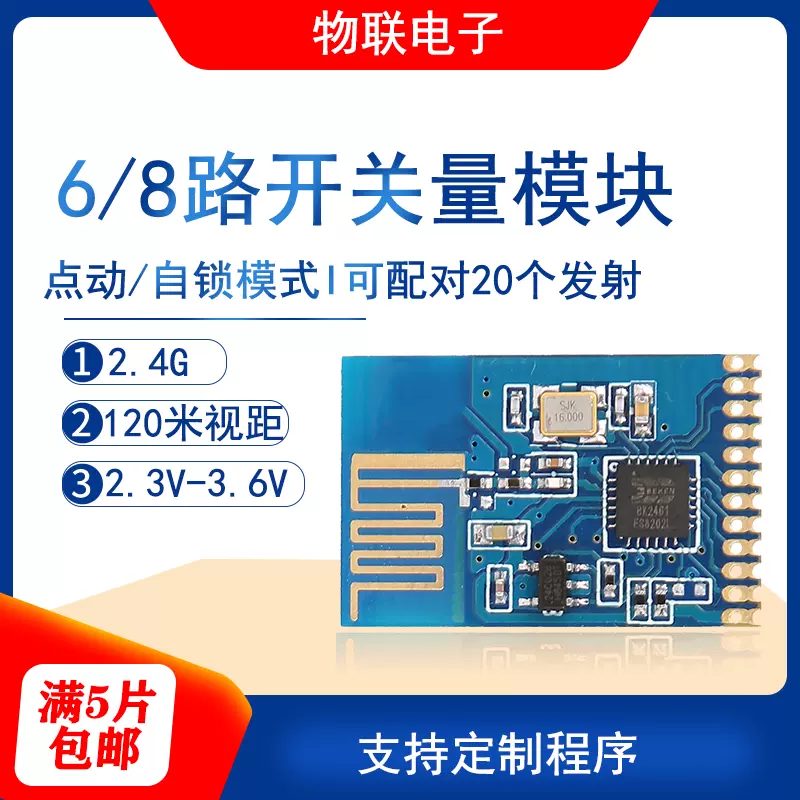 5. [物联电子2.4G无线模块8路开关量免编程点动/自锁模式可调120米](https://item.taobao.com/item.htm?_u=u2n19rn663f6&id=621650681450&spm=a1z09.2.0.0.45232e8dmODNzZ&sku_properties=-4:-8)