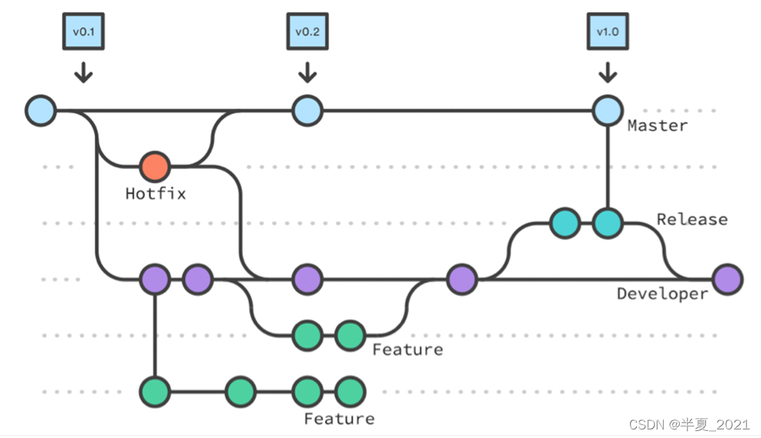 GitFlow工作流定义了一个围绕项目发布的严格分支模型,它为不同的分支分配了明确的角色,并定义分支之间何时以及如何进行交互。