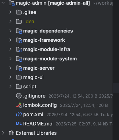 项目的名称:magic-admin , 保留了 RuoYi-Vue-Pro 的基础功能 ,同时在**客户端管理**、**代码组织结构**、 **多租户管理**这三个层面做了定制。