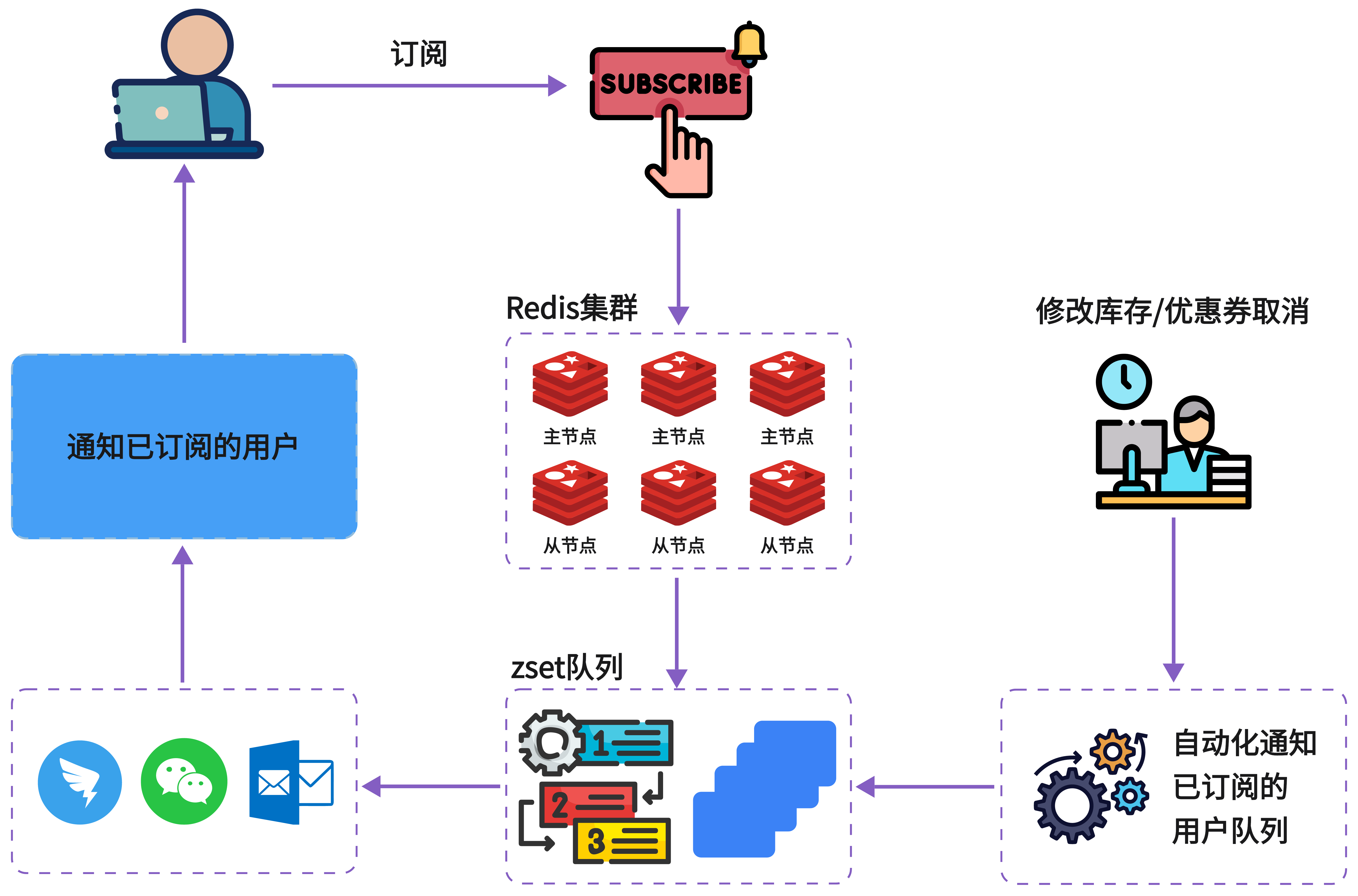 - **设计:** 当库存不足时,用户加入订阅集合(ZSet,分值为订阅时间或优先级)。