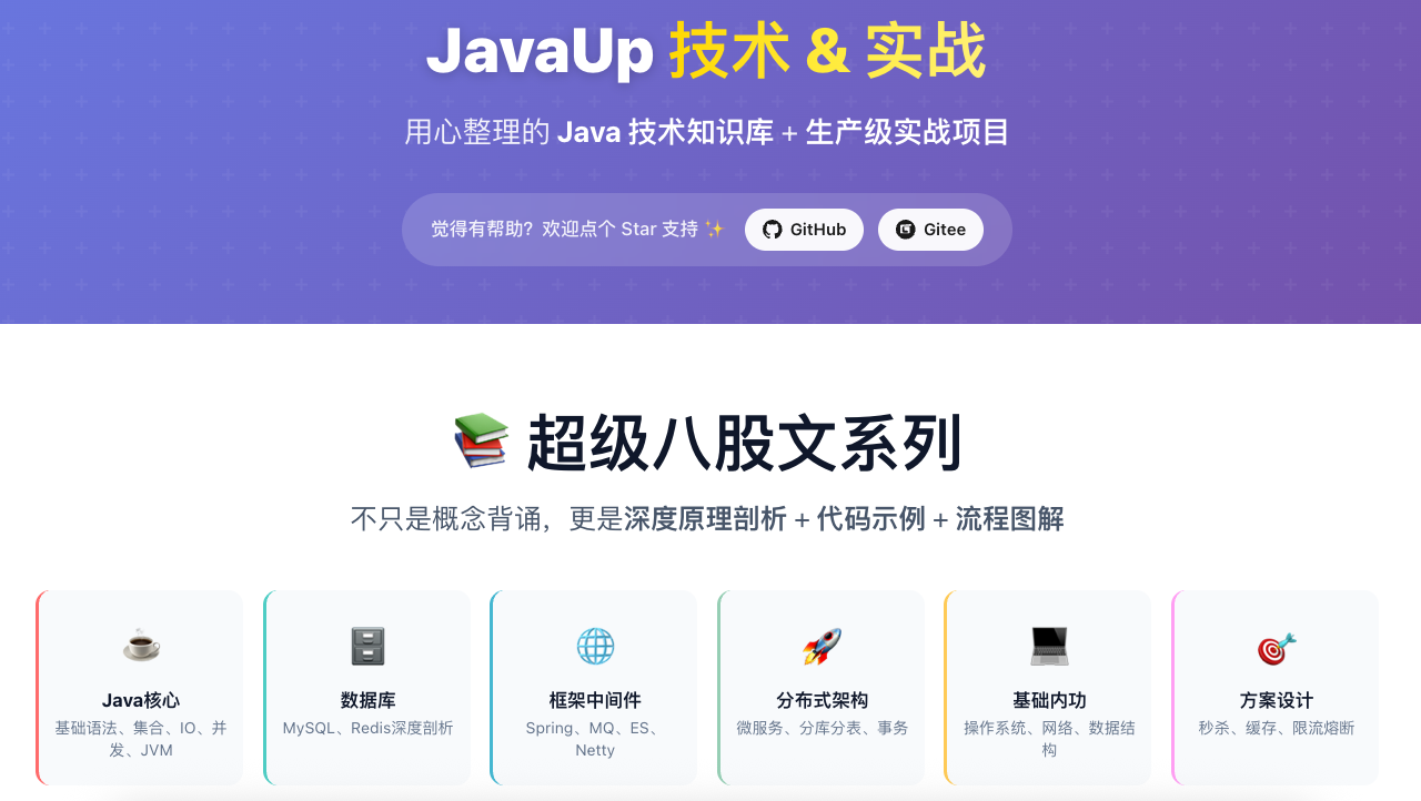 # ⭐ 请给个Star 如果觉得 **JavaUp** 的内容对你有帮助,还请点个免费的 **Star**,这是对我最大的鼓励! 感谢各位一起同行,共勉! --- # JavaUp · 技术进阶与实战 **👉 推荐在线阅读**(体验更好,速度更快):[javaup.chat](https://javaup.chat/) ## 这是什么? **JavaUp** 是一套精心打造的 Java 全栈技术知识库,累计 **100万+字** 深度技术文章,覆盖 Java 全栈技术体系,包含 **超级八股文系列** 和 **五大实战项目**。 无论你是准备面试的求职者,还是想要系统提升技术能力的开发者,这里都能找到你需要的内容。 ## 核心特点 - 📖 **技术深度详解**:从基础概念到底层原理,追根溯源式讲解 - 💻 **丰富代码示例**:每个知识点配有精心设计的代码演示 - 📊 **清晰流程图解**:复杂概念通过可视化图表呈现 - 🧩 **体系化知识结构**:完整的技术能力图谱,循序渐进 - 🎯 **面试导向设计**:围绕高频考点,直击面试官最爱问的问题 > **转载须知**:以下所有文章皆为原创,转载请在文首注明出处。如发现恶意抄袭/搬运,将保留追究法律责任的权利。让我们一起维护一个良好的技术创作环境! --- # 📖 超级八股文内容一览 所谓"八股文",是指技术面试中常见的基础理论问题。 我发现目前市面上的八股文要么知识太老旧,还在讲 JDK6、JSP、Struts2 这些过时技术, 要么就只是简单讲讲概念层面,停留在表面,内容过于浅显,让人死记硬背却难以真正理解。 **超级八股文** 则不同——它不仅告诉你"是什么",更深入讲解"为什么"和"怎么用"。通过详细的原理剖析、生动的代码示例、清晰的流程图解,让小伙伴真正理解每一个技术点,做到知其然,更知其所以然。 **累计字数 100万+,持续更新中!** ## Java 核心 ### 面试技巧 - [面试准备全攻略](docs/01-Java/01-面试技巧/01.面试准备全攻略.md) - [项目介绍与技术面试准备](docs/01-Java/01-面试技巧/02.项目介绍与技术面试准备.md) - [面试与复盘技巧](docs/01-Java/01-面试技巧/03.面试与复盘技巧.md) ### 基础知识 - [Java语言特性与核心概念](docs/01-Java/02-基础知识/01.Java语言特性与核心概念.md) - [面向对象核心概念](docs/01-Java/02-基础知识/02.面向对象核心概念.md) - [异常处理与final-finally-finalize](docs/01-Java/02-基础知识/03.异常处理与final-finally-finalize.md) - [基本类型与包装类](docs/01-Java/02-基础知识/04.基本类型与包装类.md) - [面向对象编程基础](docs/01-Java/02-基础知识/05.面向对象编程基础.md) - [接口与抽象类](docs/01-Java/02-基础知识/06.接口与抽象类.md) - [String类详解](docs/01-Java/02-基础知识/07.String类详解.md) - [泛型详解](docs/01-Java/02-基础知识/08.泛型详解.md) - [Java数值与金额精度](docs/01-Java/02-基础知识/09.Java数值与金额精度.md) - [反射与动态代理](docs/01-Java/02-基础知识/10.反射与动态代理.md) - [Java序列化详解](docs/01-Java/02-基础知识/11.Java序列化详解.md) - [JDK新版本特性详解](docs/01-Java/02-基础知识/12.JDK新版本特性详解.md) - [static关键字与枚举详解](docs/01-Java/02-基础知识/13.static关键字与枚举详解.md) - [注解机制详解](docs/01-Java/02-基础知识/14.注解机制详解.md) - [日期时间处理与线程安全](docs/01-Java/02-基础知识/15.日期时间处理与线程安全.md) - [UUID与唯一标识生成](docs/01-Java/02-基础知识/16.UUID与唯一标识生成.md) - [字符编码详解](docs/01-Java/02-基础知识/17.字符编码详解.md) - [equals与hashCode方法详解](docs/01-Java/02-基础知识/18.equals与hashCode方法详解.md) - [Arrays排序算法详解](docs/01-Java/02-基础知识/19.Arrays排序算法详解.md) - [ClassNotFoundException异常分析](docs/01-Java/02-基础知识/20.ClassNotFoundException异常分析.md) - [Request的相关概念解释](docs/01-Java/02-基础知识/21-Request的相关概念解释.md) ### 集合框架 - [Java集合框架详解](docs/01-Java/03-集合/01.Java集合框架详解.md) - [Set集合与排序机制详解](docs/01-Java/03-集合/02.Set集合与排序机制详解.md) - [集合遍历修改与并发安全](docs/01-Java/03-集合/09.集合遍历修改与并发安全.md) **HashMap 专题** - [HashMap核心原理与数据结构](docs/01-Java/03-集合/10-HashMap相关/02.HashMap核心原理与数据结构.md) - [HashMap的哈希算法与索引计算](docs/01-Java/03-集合/10-HashMap相关/03.HashMap的哈希算法与索引计算.md) - [HashMap的存取删除操作详解](docs/01-Java/03-集合/10-HashMap相关/04.HashMap的存取删除操作详解.md) - [HashMap的扩容与容量优化](docs/01-Java/03-集合/10-HashMap相关/05.HashMap的扩容与容量优化.md) - [Hash冲突原理与解决方案](docs/01-Java/03-集合/10-HashMap相关/06.Hash冲突原理与解决方案.md) - [HashMap线程安全问题与解决方案](docs/01-Java/03-集合/10-HashMap相关/07.HashMap线程安全问题与解决方案.md) - [HashMap遍历与操作最佳实践](docs/01-Java/03-集合/10-HashMap相关/08.HashMap遍历与操作最佳实践.md) **ConcurrentHashMap 专题** - [ConcurrentHashMap线程安全机制详解](docs/01-Java/03-集合/20-ConcurrentHashMap相关/09.ConcurrentHashMap线程安全机制详解.md) - [ConcurrentHashMap架构演进与设计权衡](docs/01-Java/03-集合/20-ConcurrentHashMap相关/10.ConcurrentHashMap架构演进与设计权衡.md) - [ConcurrentHashMap高级特性与最佳实践](docs/01-Java/03-集合/20-ConcurrentHashMap相关/11.ConcurrentHashMap高级特性与最佳实践.md) ### IO 相关 - [Java IO基础与流操作](docs/01-Java/04-IO相关/01.JavaIO基础与流操作.md) - [Java IO设计模式详解](docs/01-Java/04-IO相关/02.JavaIO设计模式详解.md) - [IO模型与并发处理策略](docs/01-Java/04