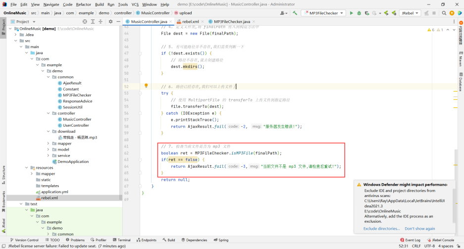 那根据接收到的返回值 , 如果为 false 的话 , 就返回状态码 -1 代表当前文件不是 mp3 文件