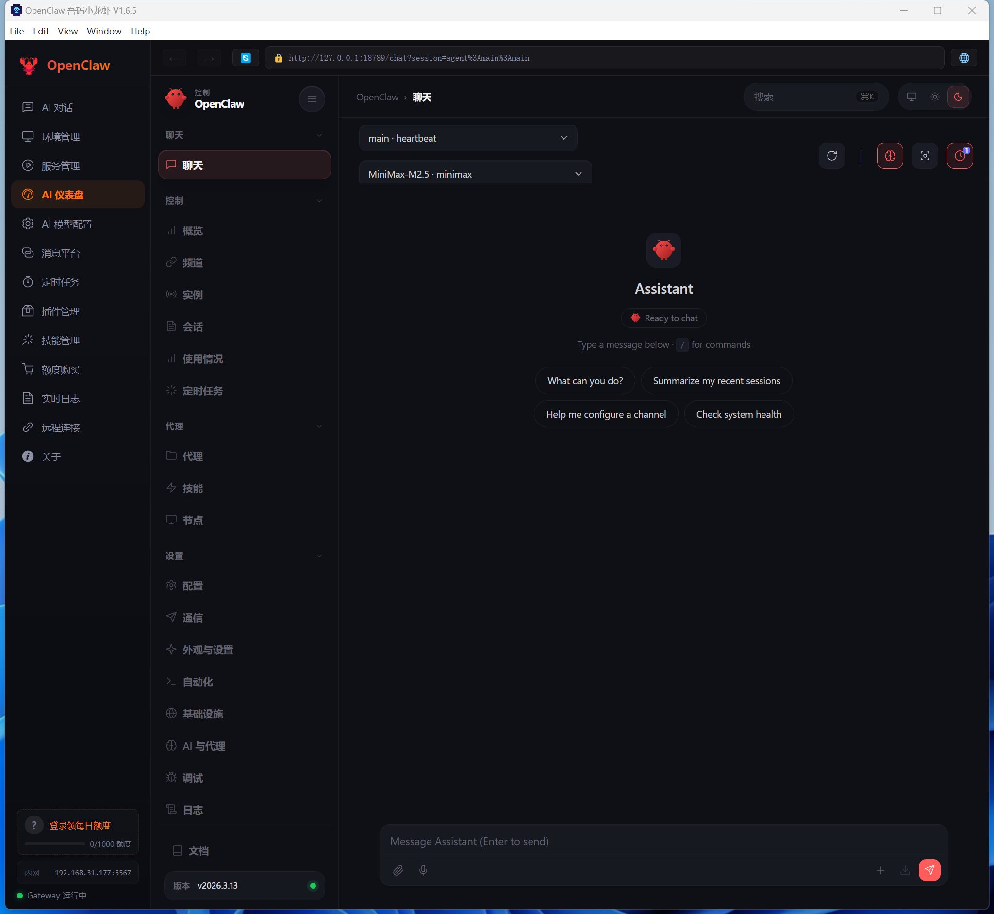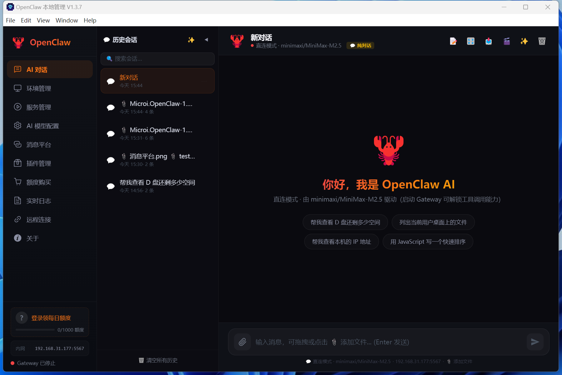 5. 进入 **服务管理** 点击启动,等待服务就绪提示后即可在 **AI 对话** 中与 AI 畅聊