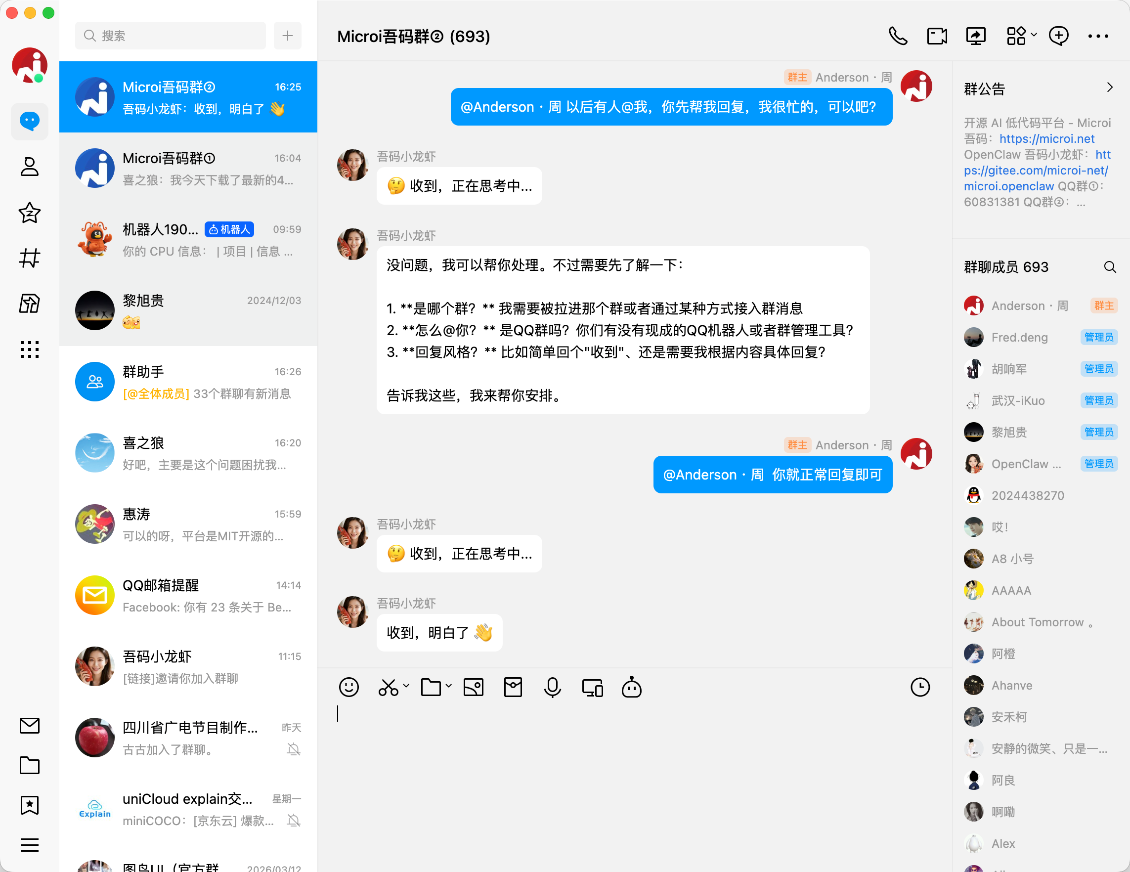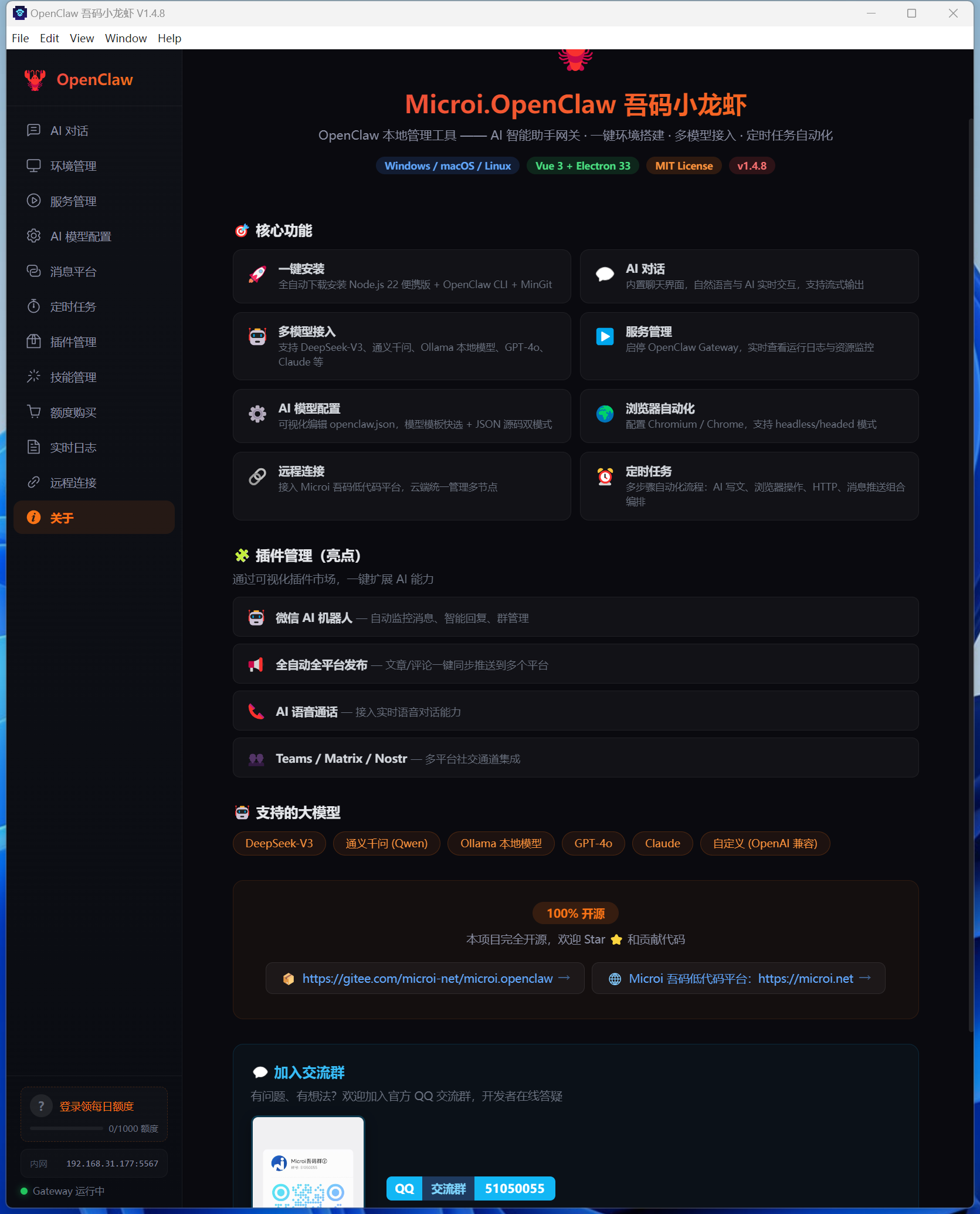 --- ## 📖 简介 **Microi.OpenClaw 吾码小龙虾** 是 [OpenClaw](https://github.com/openclaw/openclaw) 的 **一站式本地桌面管理平台**,基于 Electron + Vue 3 构建,支持 Windows / macOS / Linux 全平台。 无论你是技术小白还是资深开发者,打开即用 —— 零门槛搭建属于自己的私有 AI 智能助手,全程 **国内网络直连**,内置加速镜像,无需任何额外网络工具,一键完成 Node.js + OpenClaw + Git 全套环境安装,5 分钟内让 AI 为你工作。 >* Gitee开源地址:[https://gitee.com/microi-net/microi.openclaw](https://gitee.com/microi-net/microi.openclaw) ### 为什么选择吾码小龙虾? | 痛点 | 吾码小龙虾怎么解决 | |---|---| | 😖 环境配置太复杂,不知道装什么 | **一键安装**全套依赖,无需手动配置任何环境变量 | | 🌐 国内访问 npm / GitHub 速度慢 | 内置**国内加速镜像**,所有资源均可直连下载 | | 🤖 大模型 API 不知道怎么接 | 内置主流模型**一键模板**,填入 API Key 即可使用 | | 🔒 担心数据安全,不想用云端服务 | **完全本地运行**,对话数据不经过任何第三方服务器 | | 🛠️ 想扩展 AI 能力但不会开发 | 可视化**插件市场**,微信机器人/语音通话等一键安装 | ### 核心功能| 功能 | 说明 |