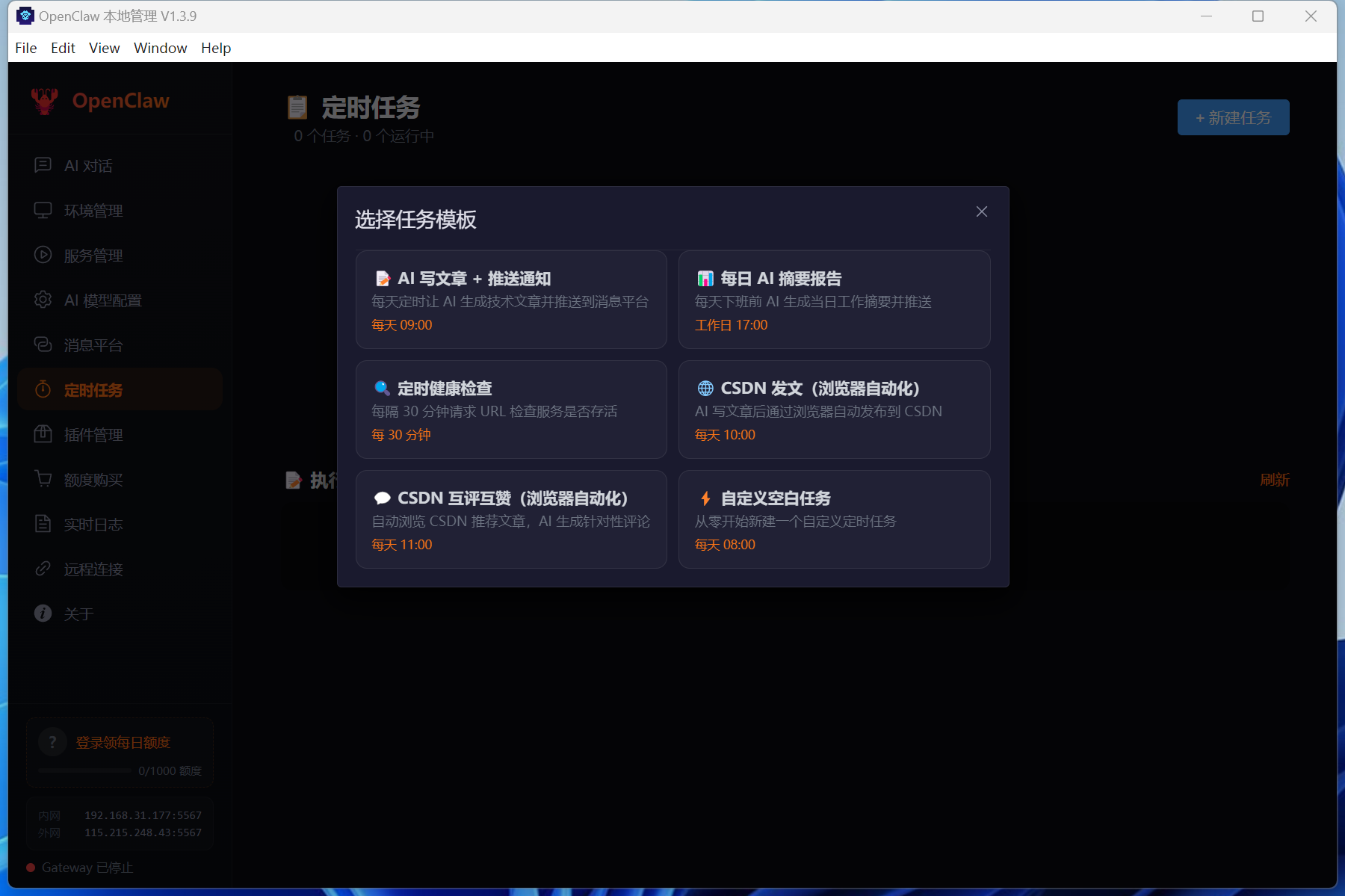 | ⏰ 定时任务 | 多步骤自动化:AI 写文 → 浏览器发文 → 消息推送,像搭积木一样组合(AI 内容生成、浏览器自动化、HTTP 请求、消息推送、延时等待),内置 6 套模板 |