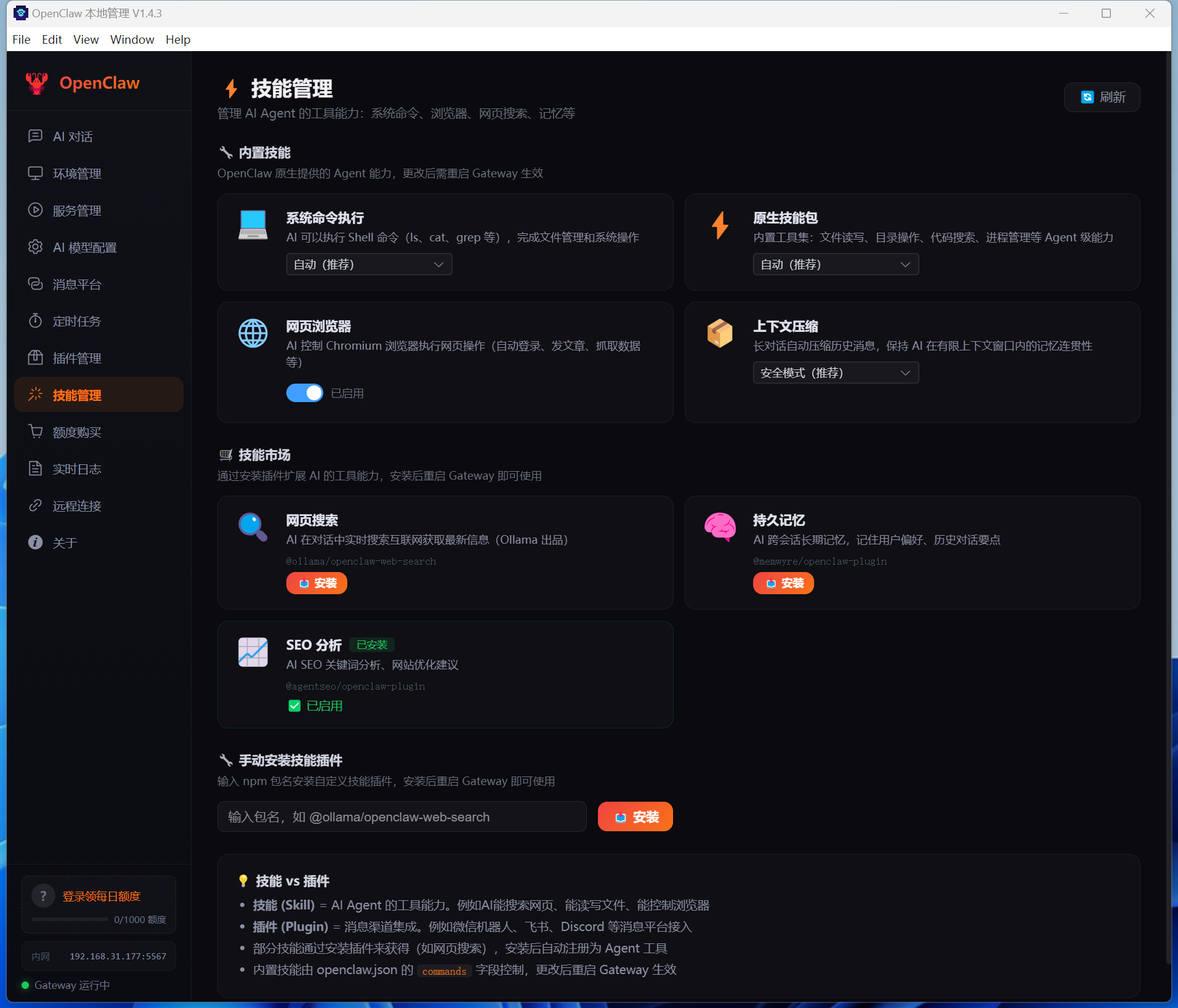 | 🧠 技能管理 | 管理 AI 内置技能(命令执行、浏览器、上下文压缩)及可安装技能(联网搜索、记忆、SEO),支持手动安装自定义技能包 |