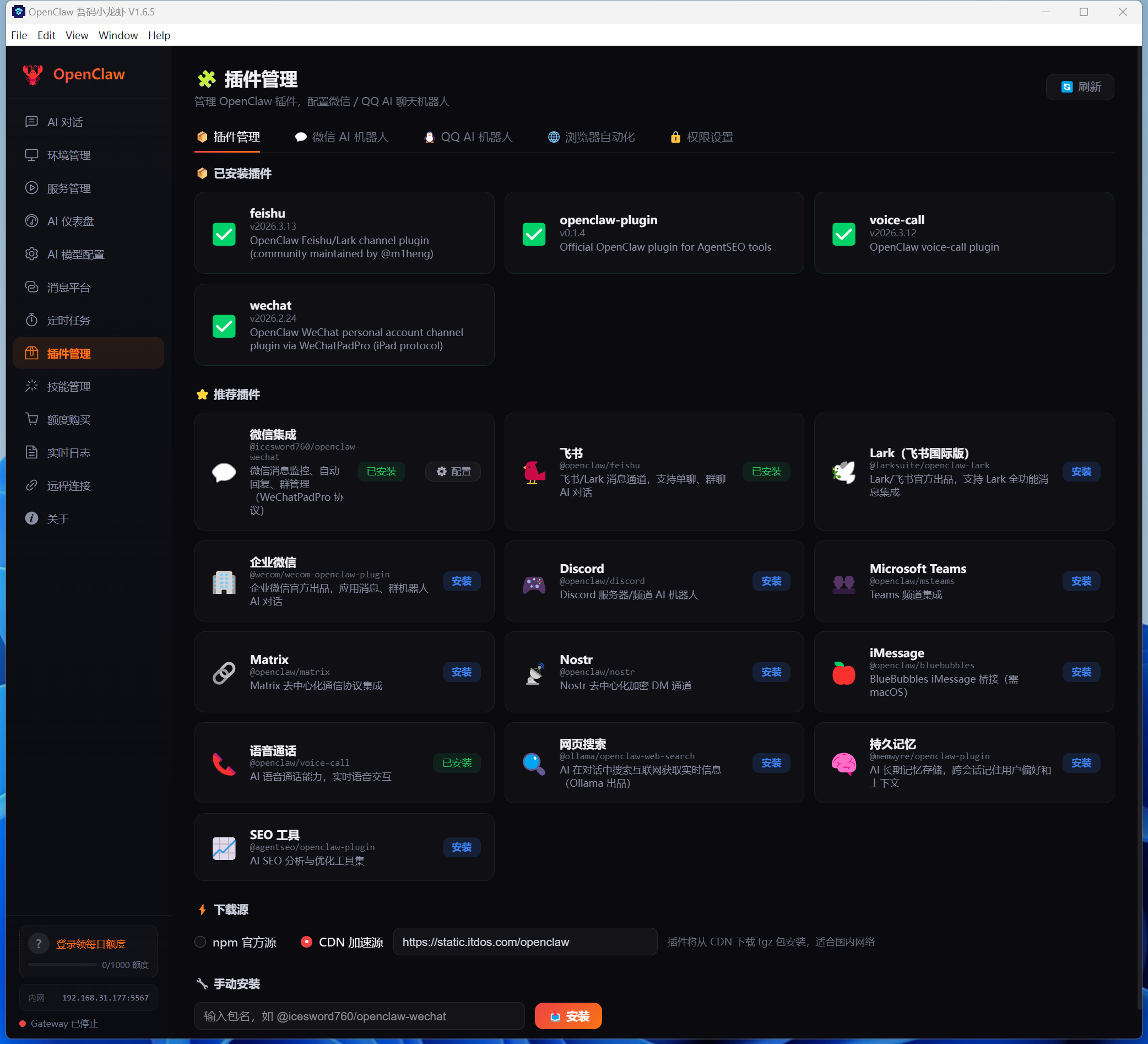 | 🧩 插件管理 | 可视化插件市场,一键安装微信机器人、语音通话、Teams、Matrix 等插件,支持 npm + CDN 双源 |