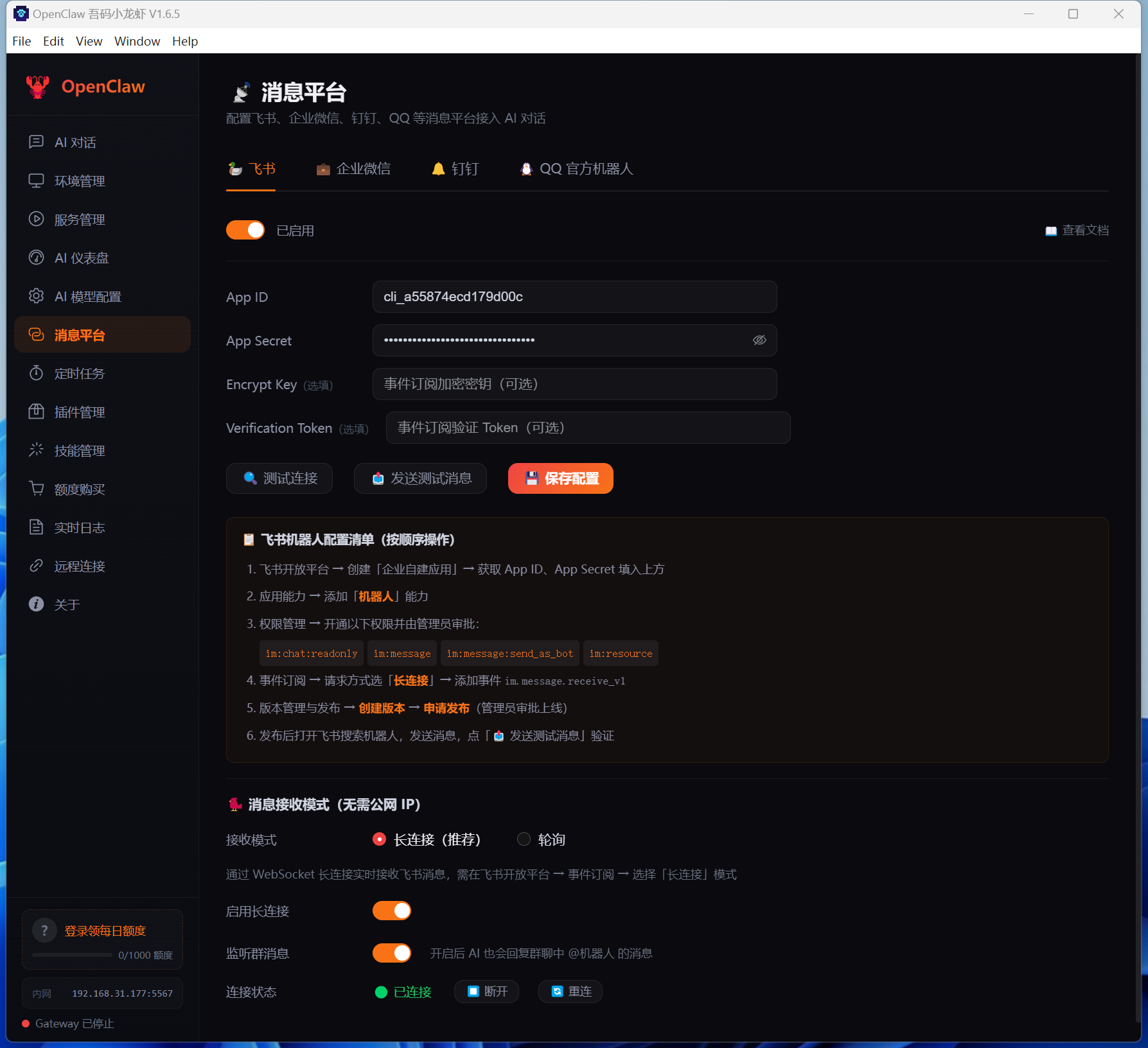 | 📢 消息平台 | 飞书机器人集成,支持 WebSocket 长连接 / 轮询两种模式,自动接收消息并交由 AI 回复 |