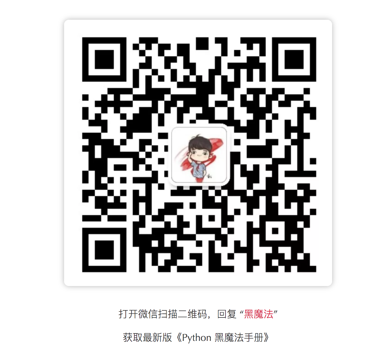 ## 在线阅读 在线阅读:[《Python 黑魔法指南》](http://magic.iswbm.com/) ## 目录大纲  (以下链接无效,请前往 PDF 进行阅读) - [第一章:魔法冷知识](#---------) * [1.1 默默无闻的省略号很好用](#11------------) * [1.2 使用 end 来结束代码块](#12----end-------) * [1.3 可直接运行的 zip 包](#13--------zip--) * [1.4 反斜杠的倔强: 不写最后](#14-------------) * [1.5 如何修改解释器提示符](#15-----------) * [1.6 简洁而优雅的链式比较](#16------------) * [1.7 and 和 or 的短路效应](#17-and---or------) * [1.8 连接多个列表最极客的方式](#18-------------) * [1.9 字典居然是可以排序的?](#19------------) * [1.10 哪些情况下不需要续行符?](#110-------------) * [1.11 用户无感知的小整数池](#111-----------) * [1.12 神奇的 intern 机制](#112-----intern---) * [1.13 site-packages和 dist-packages](#113-site-packages--dist-packages) * [1.14 argument 和 parameter 的区别](#114-argument---parameter----) * [1.15 /usr/bin/env python 有什么用?](#115--usr-bin-env-python------) * [1.16 dict() 与 {} 生成空字典有什么区别?](#116-dict-------------------) * [1.17 有趣但没啥用的 import 用法](#117---------import---) * [1.18 正负得正,负负得正](#118----------) * [1.19 return不一定都是函数的终点](#119-return----------) * [1.20 字符串里的缝隙是什么?](#120------------) * [1.21 Python2下 也能使用 print(“”)](#121-python2-------print----) * [1.22 字母也玩起了障眼法](#122----------) * [1.23 数值与字符串的比较](#123----------) * [1.24 时有时无的切片异常](#124----------) * [1.25 迷一样的字符串](#125--------) * [1.26 x 与 +x 等价吗?](#126-x----x-----) * [1.27 += 不等同于=+](#127----------) * [1.28 循环中的局部变量泄露](#128-----------) * [1.29 局部/全局变量傻傻分不清](#129-------------) * [1.30 break /continue 和 上下文管理器哪个优先级高?](#130-break--continue----------------) - [第二章:魔法命令行](#---------) * [2.1 懒人必备技能:使用 “_”](#21--------------) * [2.2 最快查看包搜索路径的方式](#22-------------) * [2.3 使用 json.tool 来格式化 JSON](#23----jsontool------json) * [2.4 命令行式执行 Python 代码](#24--------python---) * [2.5 用调试模式执行脚本](#25----------) * [2.6 如何快速搭建 FTP 服务器](#26--------ftp----) * [2.7 快速构建 HTML 帮助文档](#27------html-----) * [2.8 最正确且优雅的装包方法](#28------------) * [2.9 往 Python Shell 中传入参数](#29---python-shell------) * [2.10 让脚本报错后立即进入调试模式](#210---------------) * [2.11 极简模式执行 Python Shell](#211--------python-shell) * [2.12 在执行任意代码前自动念一段平安经](#212-----------------) * [2.13 启动 Python Shell 前自动执行某脚本](#213----python-shell---------) - [第三章:炫技魔法操作](#----------) * [3.1 八种连接列表的方式](#31----------) + [1、最直观的相加](#1-------) + [2、借助 itertools](#2----itertools) + [3、使用 * 解包](#3--------) + [4、使用 extend](#4----extend) + [5、使用列表推导式](#5--------) + [6、使用 heapq](#6----heapq) + [7、借助魔法方法](#7-------) + [8. 使用 yield from](#8----yield-from) * [3.2 合并字典的 8 种方法](#32-------8----) + [1、最简单的原地更新](#1---------) + [2、先解包再合并字典](#2---------) + [3、借助 itertools](#3----itertools) + [4、借助 ChainMap](#4----chainmap) + [5、使用dict.items() 合并](#5---dictitems-----) + [6、最酷炫的字典解析式](#6----------) + [7、Python 3.9 新特性](#7-python-39----) * [3.3 花式导包的八种方法](#33----------) + [1. 直接 import](#1----import) + [2. 使用 \__import__](#2-------import--) + [3. 使用 importlib 模块](#3----importlib---) + [4. 使用 imp 模块](#4----imp---) + [5. 使用 execfile](#5----execfile) + [6. 使用 exec 执行](#6----exec---) + [7. import_from_github_com](#7-import-from-github-com) + [8、远程导入模块](#8-------) * [3.4 条件语句的七种写法](#34----------) + [第一种:原代码](#-------) + [第二种](#---) + [第三种](#---) + [第四种](#---) + [第五种](#---) + [第六种](#---) + [第七种](#---) * [3.5 判断是否包含子串的七种方法](#35--------------) + [1、使用 in 和 not in](#1----in---not-in) + [2、使用 find 方法](#2----find---) + [3、使用 index 方法](#3----index---) + [4、使用 count 方法](#4----count---) + [5、通过魔法方法](#5-------) + [6、借助 operator](#6----operator) + [7、使用正则匹配](#7-------) * [3.6 海象运算符的三种用法](#36-----------) + [第一个用法:if/else](#------if-else) + [第二个用法:while](#------while) + [第三个用法:推导式](#---------) - [第四章:魔法进阶扫盲](#----------) * [4.1 精通装饰器八大用法](#41----------) + [Hello,装饰器](#hello----) + [入门:日志打印器](#--------) + [入门:时间计时器](#--------) + [进阶:带参数的函数装饰器](#------------) + [高阶:不带参数的类装饰器](#------------) + [高阶:带参数的类装饰器](#-----------) + [使用偏函数与类实现装饰器](#------------) + [如何写能装饰类的装饰器?](#------------) + [wraps 装饰器有啥用?](#wraps--------) * [4.2 深入理解描述符](#42--------) + [为什么要使用描述符?](#----------) + [描述符的访问规则](#--------) + [基于描述符如何实现property](#---------property) + [基于描述符如何实现staticmethod](#---------staticmethod) + [基于描述符如何实现classmethod](#---------classmethod) + [所有实例共享描述符](#---------) * [4.3 精通上下文管理器](#43---------) + [what context manager?](#what-context-manager-) + [how context manager?](#how-context-manager-) + [why context manager?](#why-context-manager-) + [how contextlib?](#how-contextlib-) - [第五章:魔法开