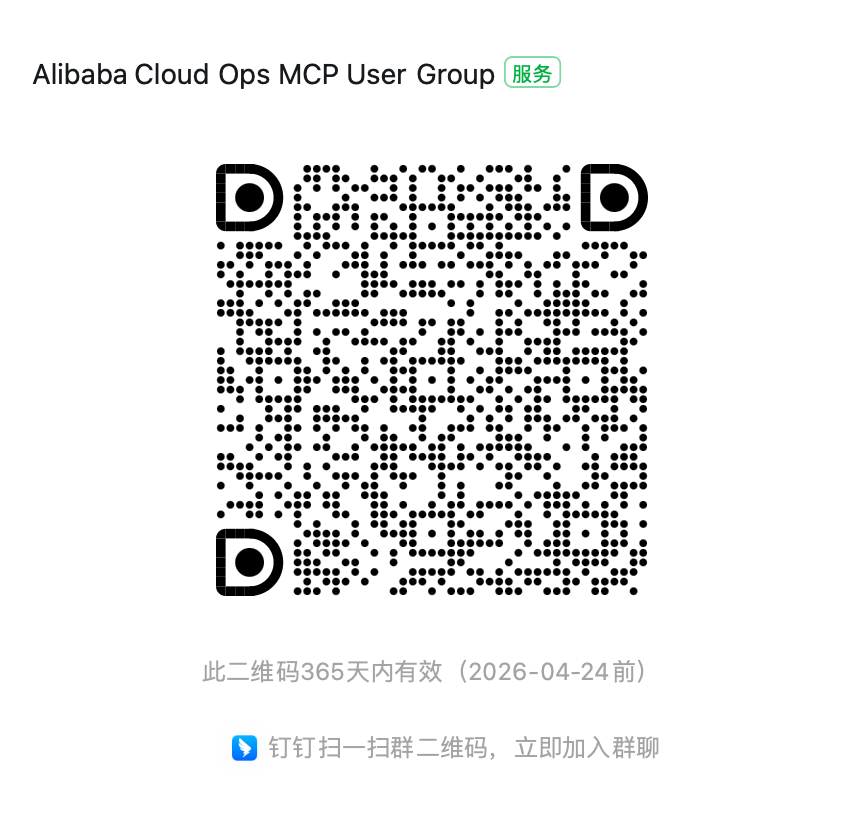如果您有任何疑问,欢迎加入 [Alibaba Cloud Ops MCP 交流群](https://qr.dingtalk.com/action/joingroup?code=v1,k1,iFxYG4jjLVh1jfmNAkkclji7CN5DSIdT+jvFsLyI60I=&_dt_no_comment=1&origin=11) (钉钉群:113455011677) 进行交流。