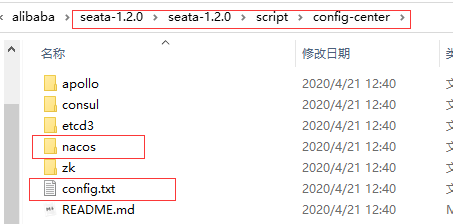 注意:nacos-config.sh在seata目录下、config.txt在seata外