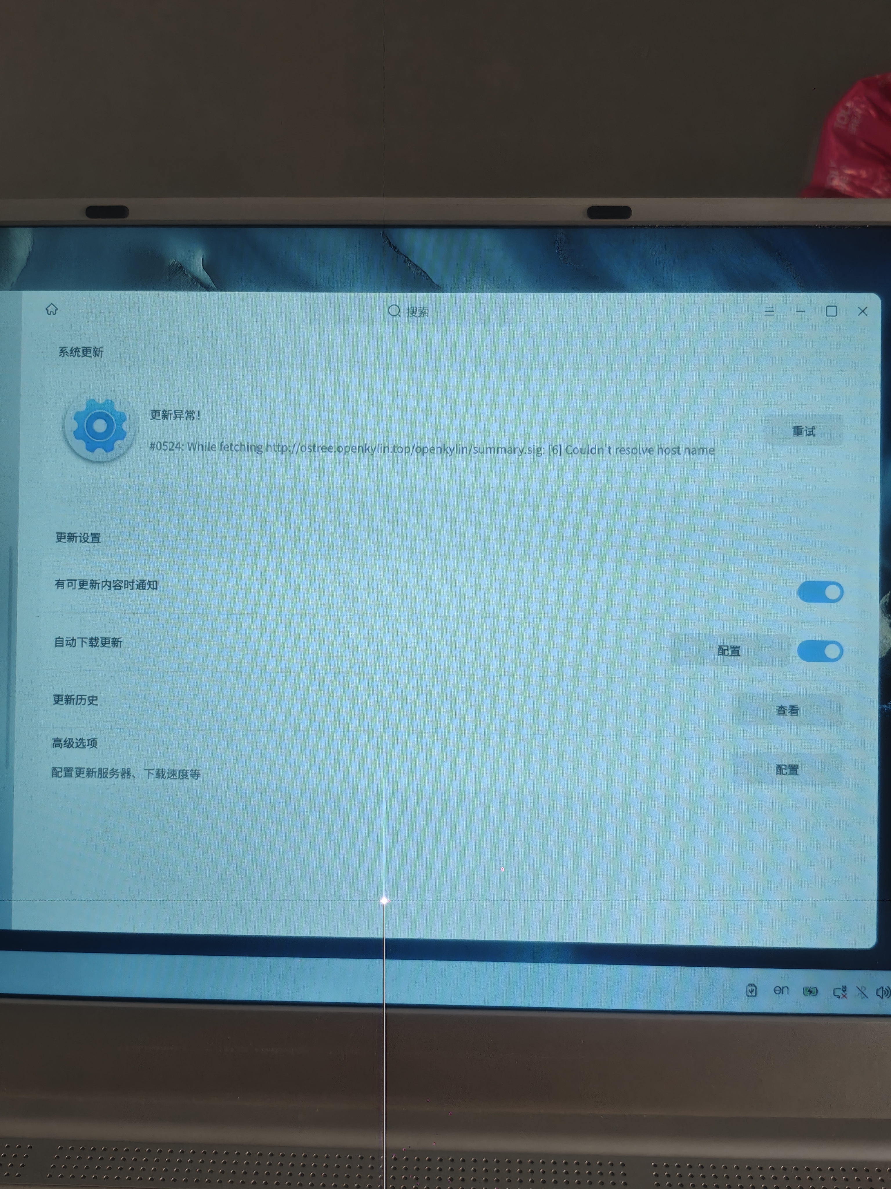 进入后的新系统在设置页面里的更新选项里面显示更新异常,无法进行更新,希望优化改进一下,谢谢! 图片附件内容如下: