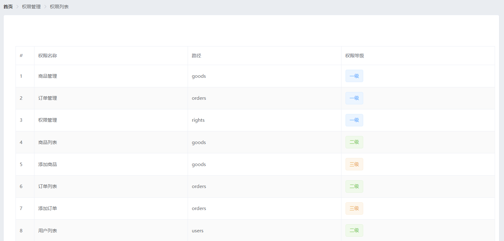 权限管理:包括角色列表和权限列表两个模块。角色列表中可以添加角色,供用户分配角色选择角色,对已有的角色管理员可以进行编辑、删除、分配权限操作。权限列表中是已定义好的权限,包括权限路径和权限等级,根据权限等级可以清楚了解该权限的上下级关系。