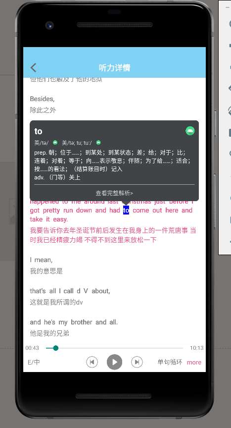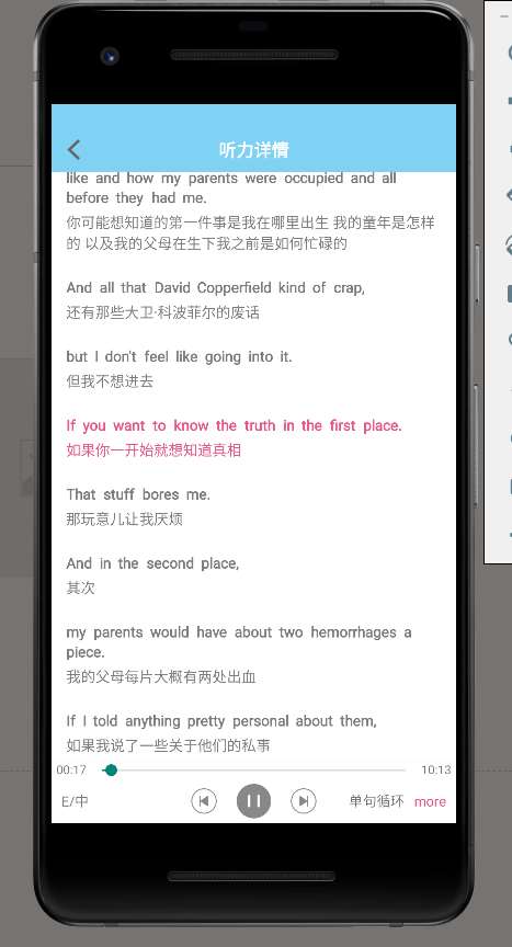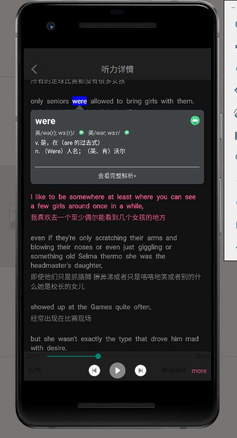 - **Description**: 实现英语听力的在线播放,暂停,列表播放联动,上/下一句切换/单词解析/英/美双语切换功能,中/英切换显示功能/App夜间模式/二分法算法实现当前播放的字幕与音频文件的对应播放