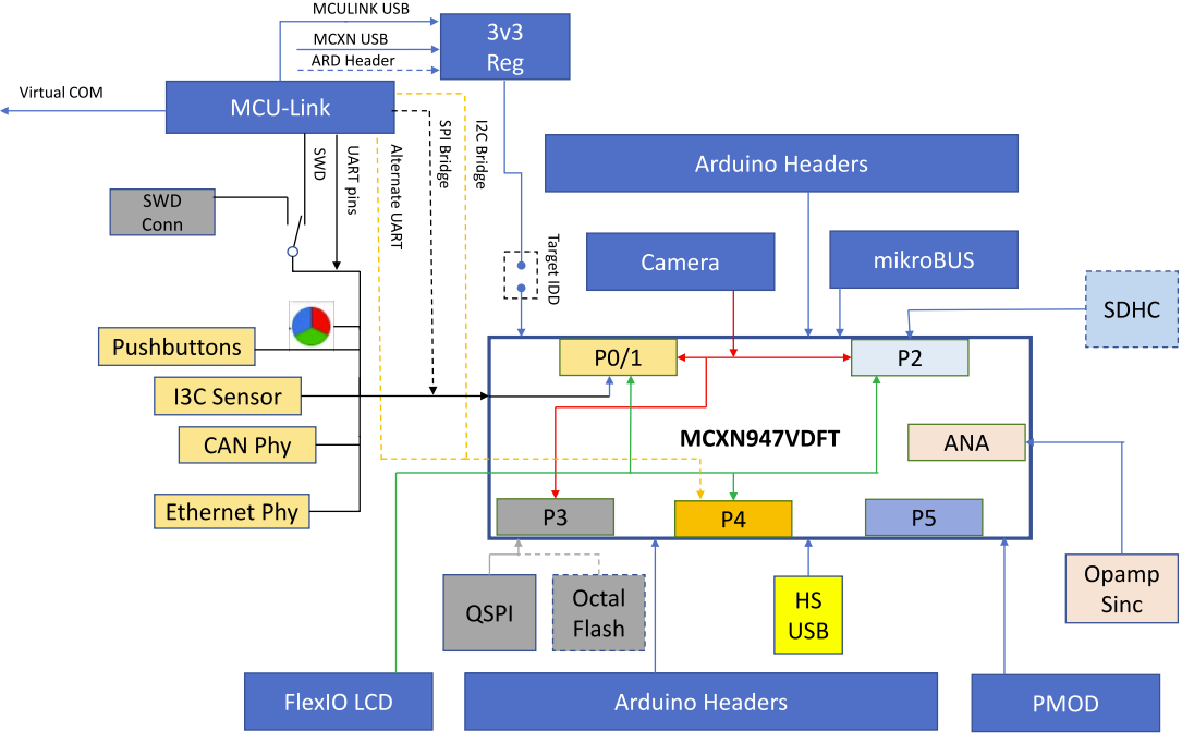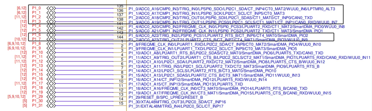 ++ 高达1MB的闪存,高达256KB的RAM,带8KB的纠错码(ECC),支持乘法累加单元(MAU)和SmartDMA、控制器局域网灵活数据速率(CAN-FD)、低功耗通用异步收发器(LPUART)、低功耗串行外设接口(LPSPI)、低功耗内部集成电路(LPI2C)、DMA和低压差稳压器(LDO)