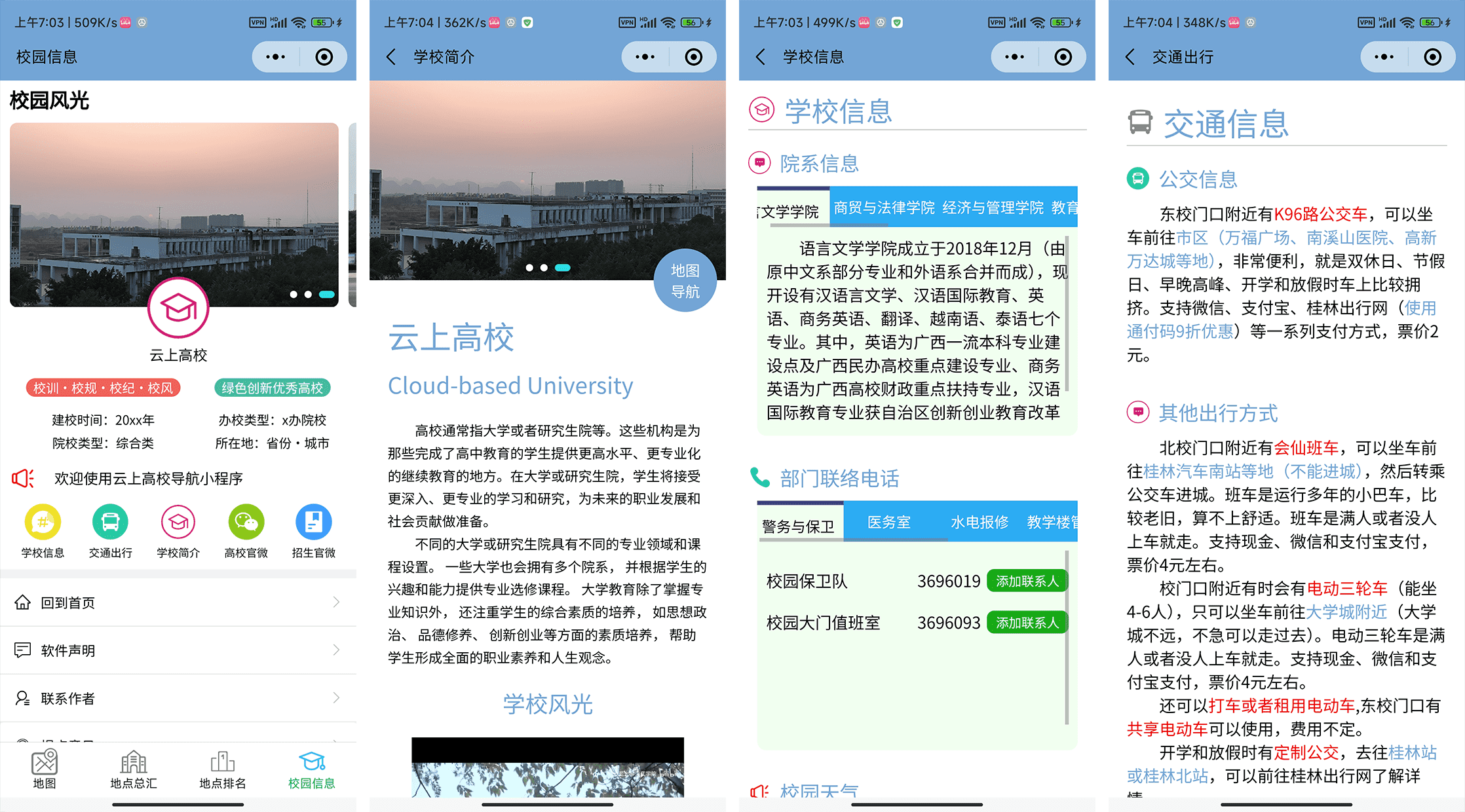 - **Description**: 中国大学生计算机设计大赛 软件应用与开发 - 移动应用开发(非游戏类) 广西赛区 三等奖——“云上高校导航”,是一套基于小程序云开发的校园导航类系统开发方案,该开发方案可供开发者进行二次开发,用于解决师生和访客的校园出行需求。