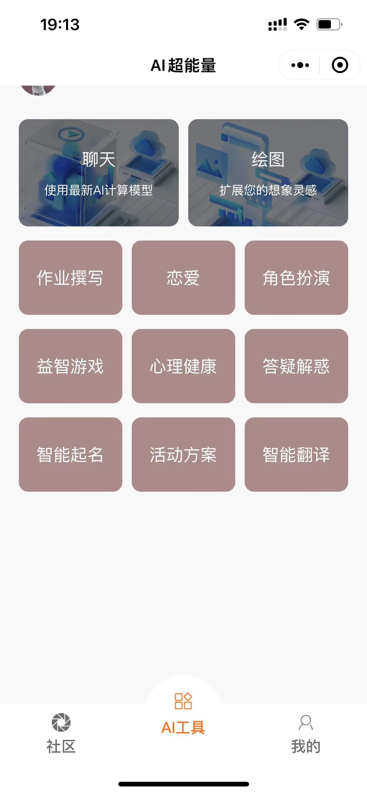 - **Description**: AI超能力是一个基于springboot实现的完全开源chatgpt项目,实现智能聊天、文本绘图、图片编辑、智能翻译、作业撰写、活动方案编写、智能起名、心理健康咨询、答疑解惑等功能,后续也会陆续推出其它好玩的新功能,请继续关注我们。