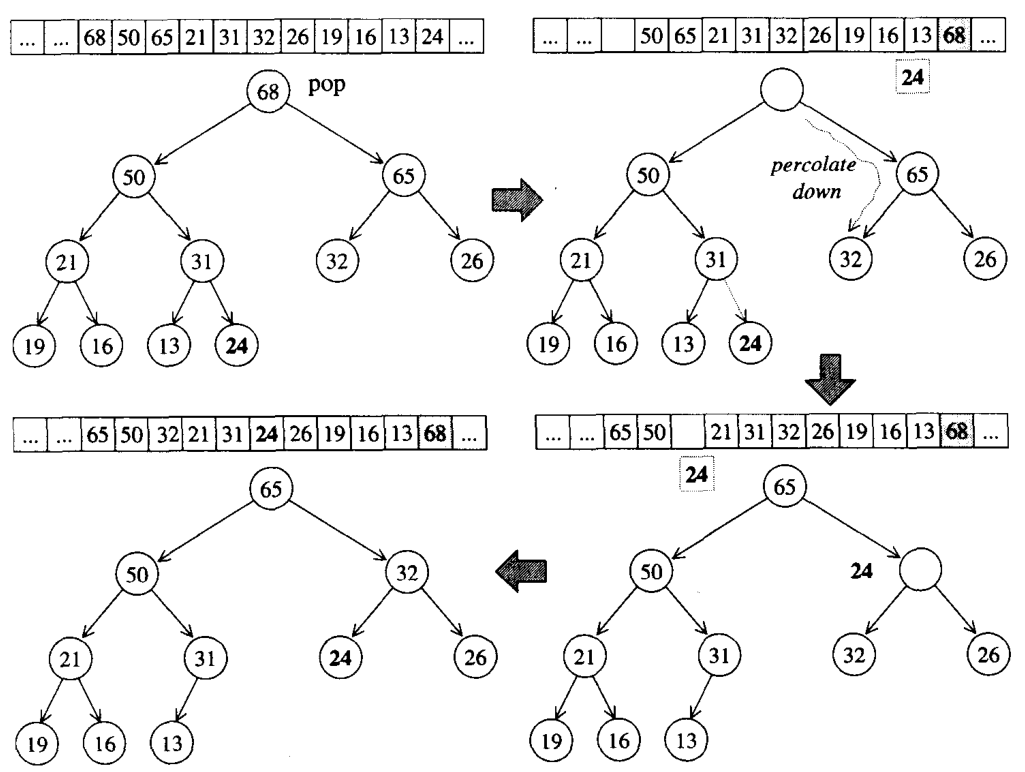 根节点68被pop之后,移到了vector的最底部,将24挤出,24被迫从根节点开始与其子节点进行比较,直到找到合适的位置安身,需要注意的是pop之后元素并没有被移走,如果要将其移走,可以使用pop_back()。
