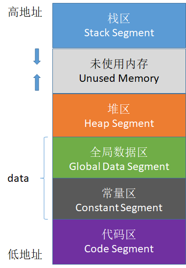 一般分为五个区域:栈区、堆区、函数区(存放函数体等二进制代码)、全局静态区、常量区