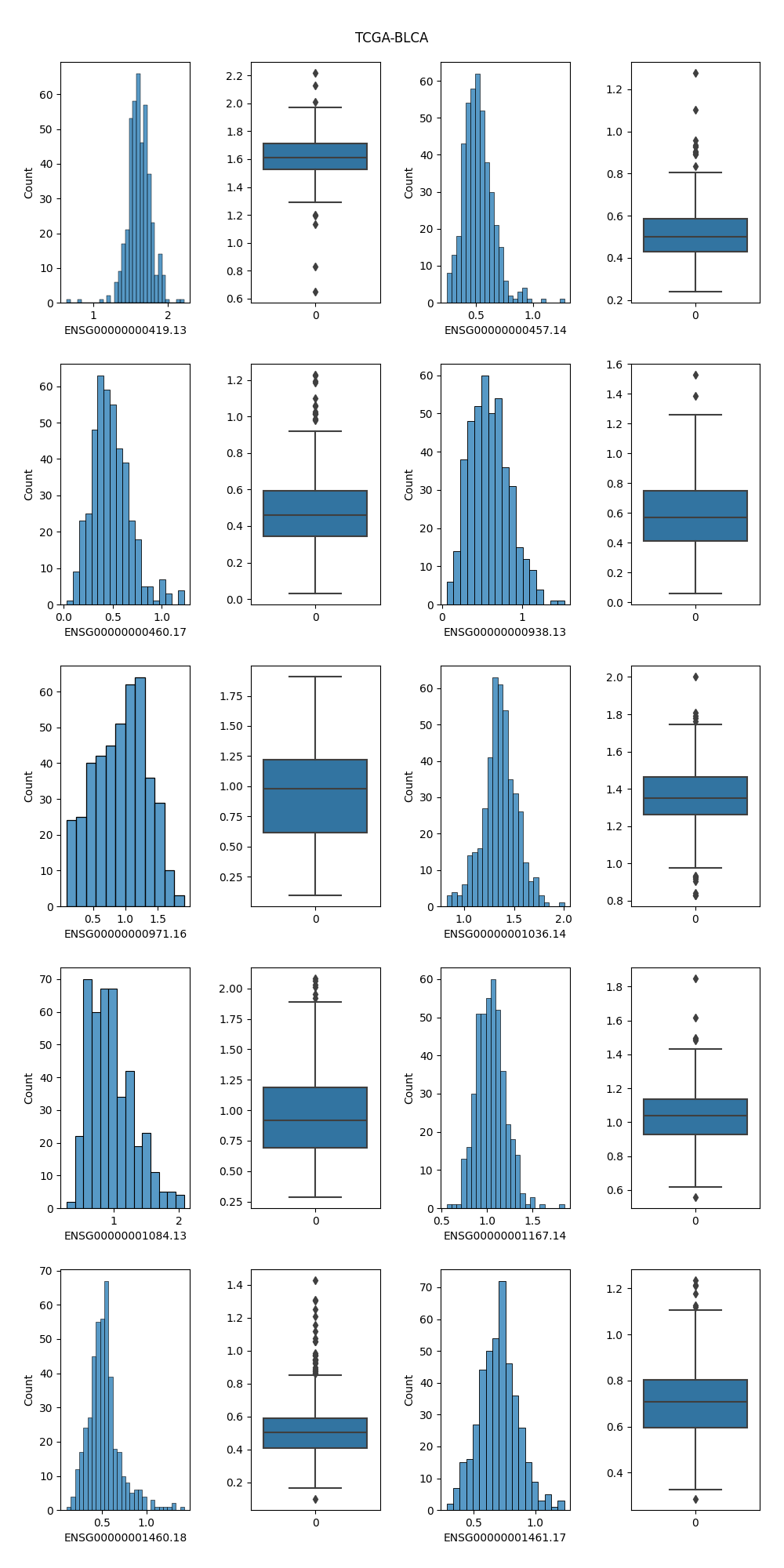 经过观察我发现,基因ID为:ENSG00000000419.13、ENSG00000000457.14、ENSG00000000460.17、ENSG00000000938.13、ENSG00000000971.16、ENSG00000001036.14、ENSG00000001084.13、ENSG00000001167.14、ENSG00000001460.18和ENSG00000001461.17的基因在五种癌症中都有较高的表达了,不妨选取这十个RNA维度并绘制相关图像进行比较分析。