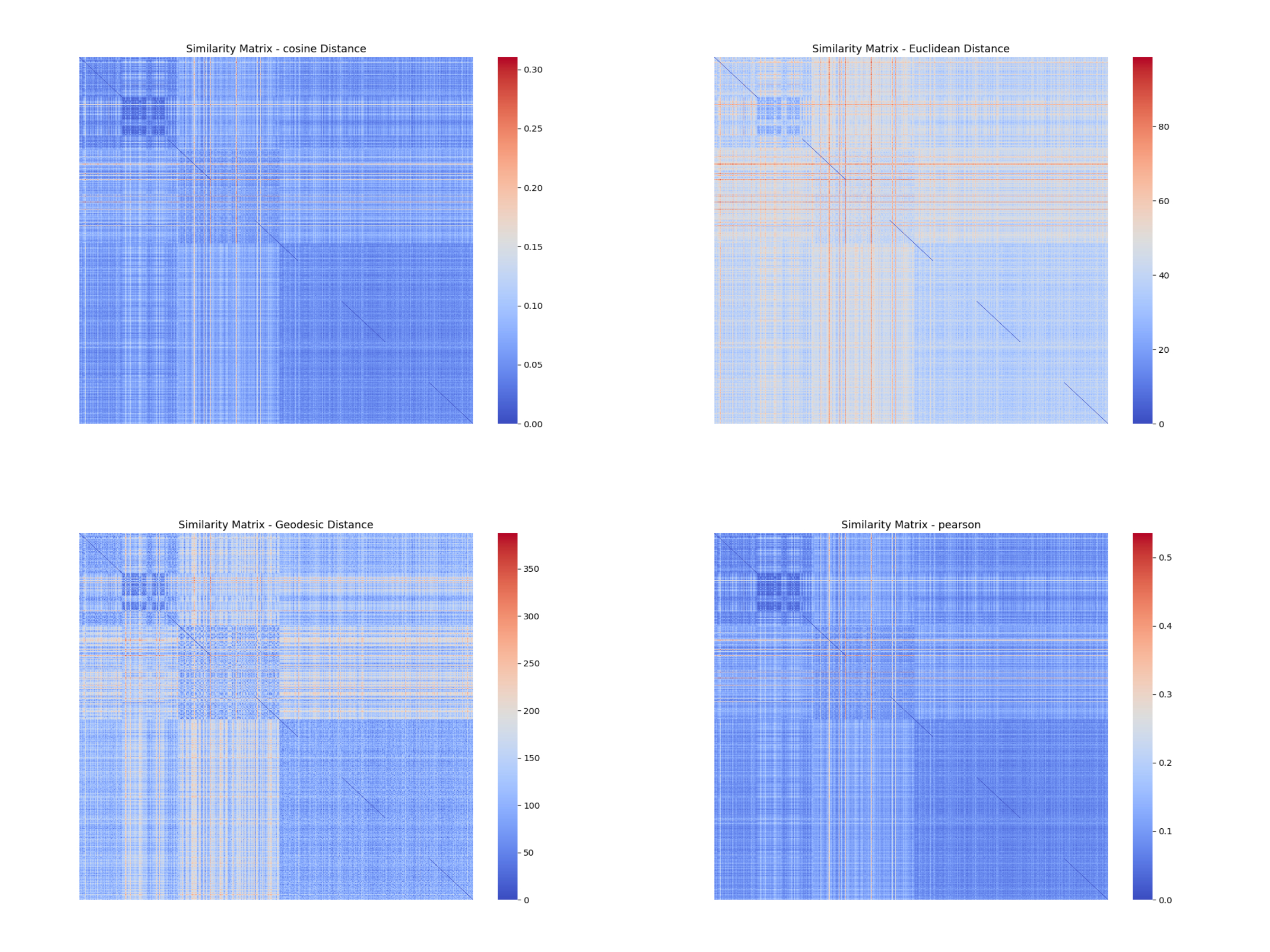 - 在高维情况下,余弦距离、欧式距离和皮尔逊相关距离区分不同簇的能力不强,不同分块之间的颜色有时几乎并无差别,都为蓝色。