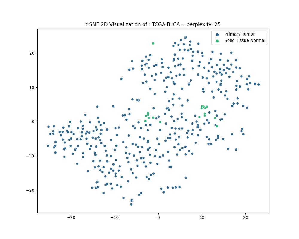 1. 除了在**BCLA**数据集中,Solid Tissue Normal——实体正常组织都能聚合在一个簇中,**并与癌症组织分开**。