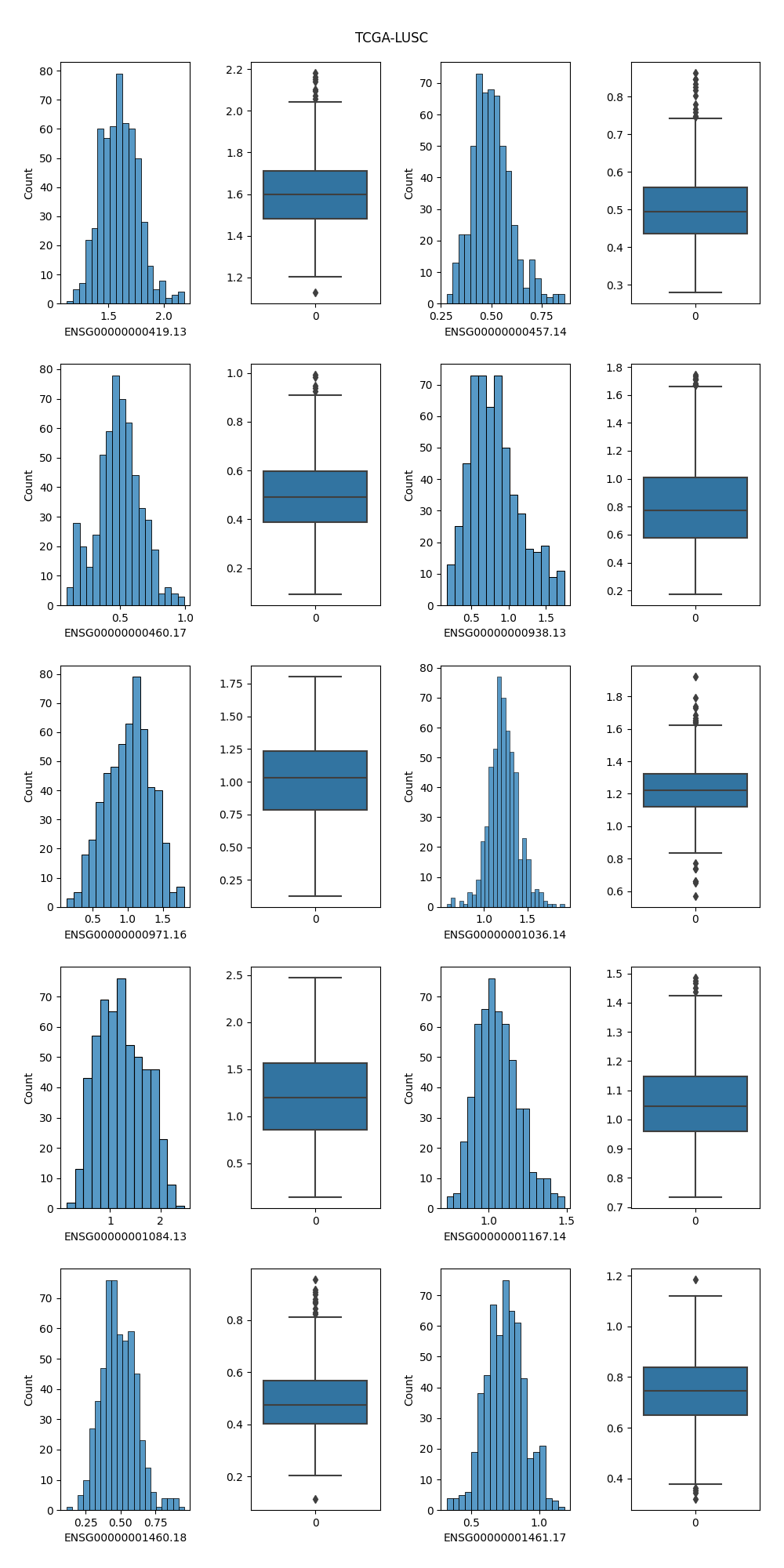### 4.2 任选10 个RNA 维度(属性),分别画出每个维度的直方图和盒状图,并进行跨数据集比较。
