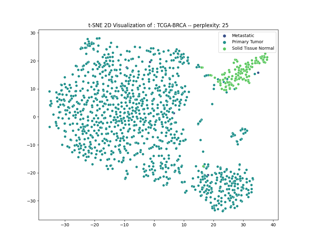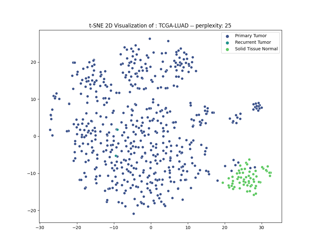 2. 由于每个样本的RNA-seq的维度有大约30000,因此我选择使用t-sne对数据进行降维至2维进行可视化。