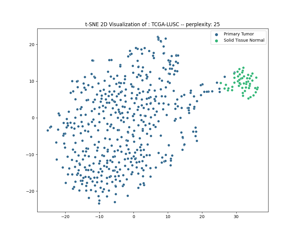 3. 尽管降维后的数据可视化图中的样本簇之间的距离并不能反映真实的样本距离,但可以认为癌症组织的RNA表达和正常组织的RNA表达确实存在差异,一定程度上可以被分隔开。