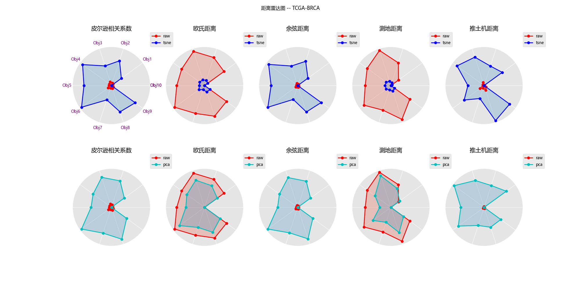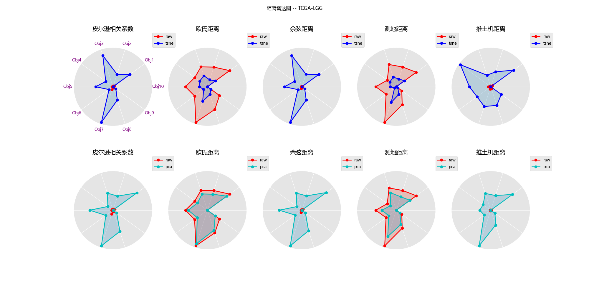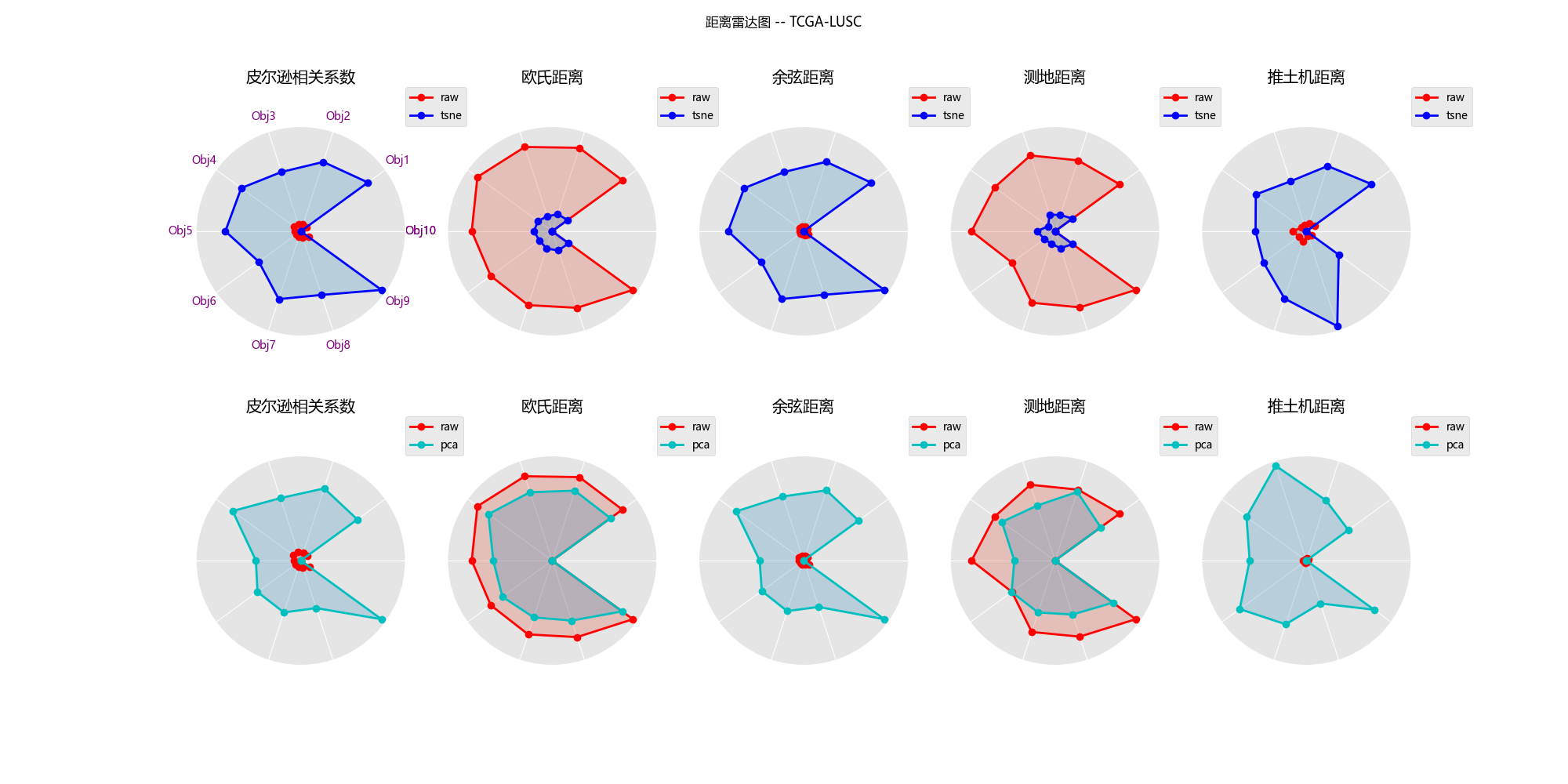 3. 而皮尔逊相关距离和余弦距离度量下,使用这两种降维方法效果都很差。
